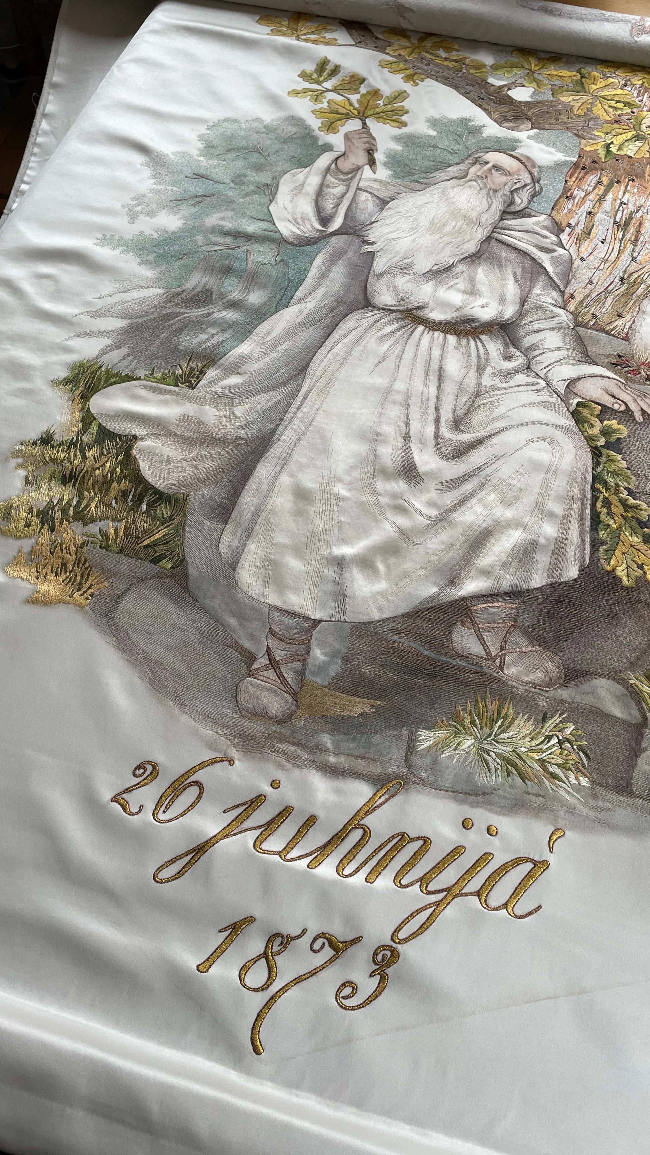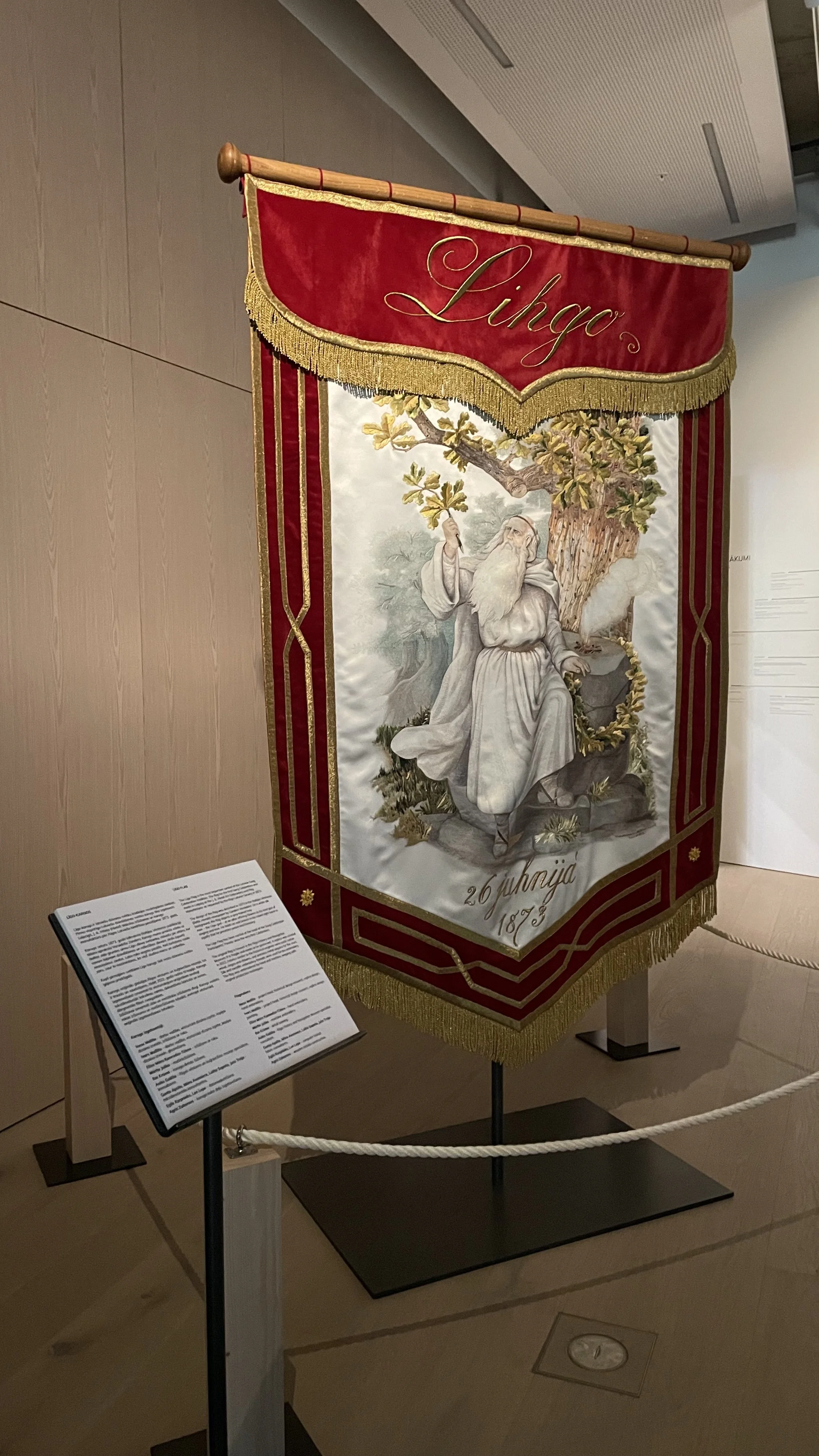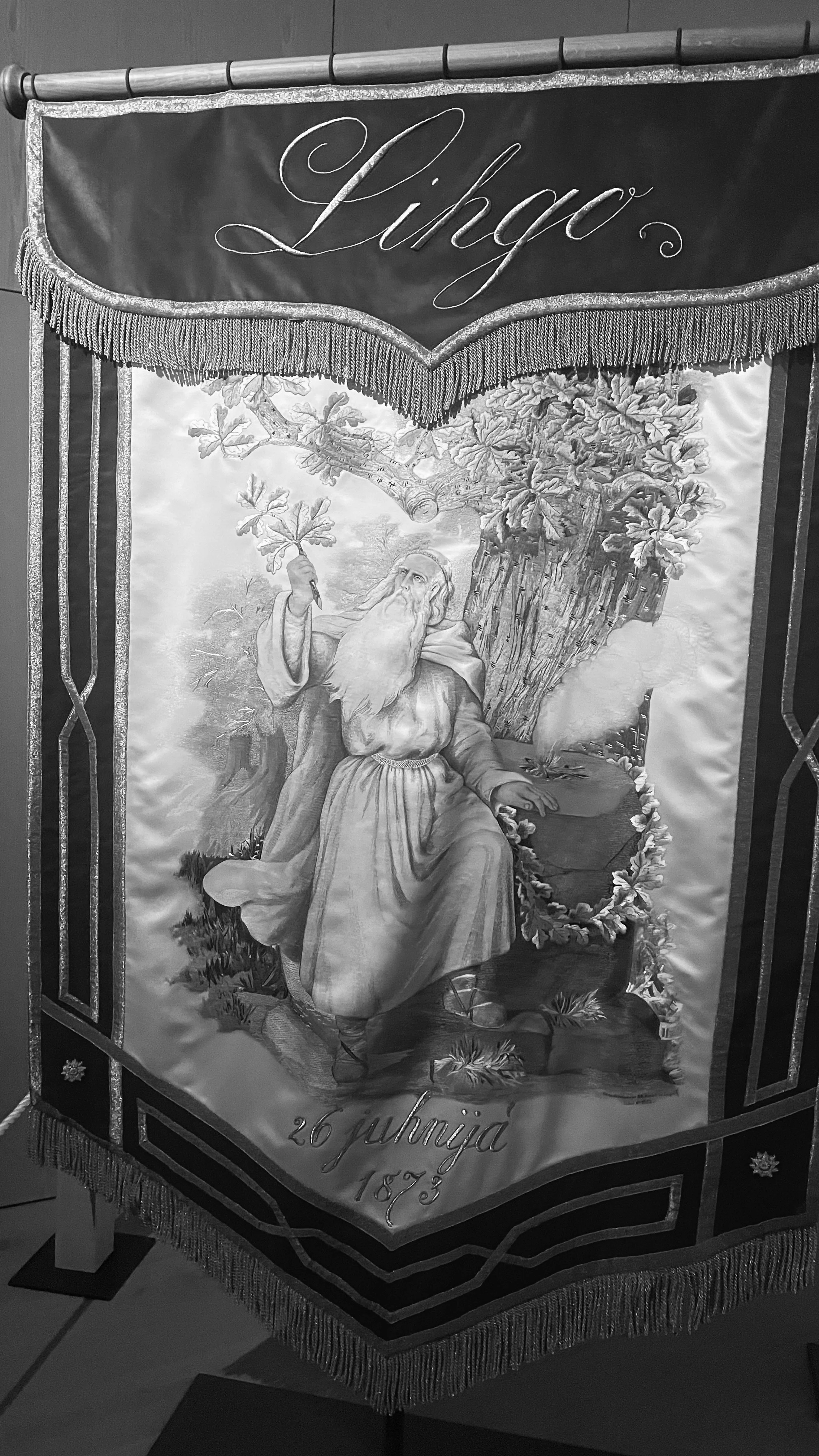 The Līgo flag is the most important symbol of the Latvian Song and Dance Celebration. Since the very first festival in 1873, the Līgo flag has been carried at the front of the Song Celebration’s opening procession. The original flag is kept in a museum collection because of it’s very fragile state and requires careful preservation, therefore, this flag in the Dziesmusvētku telpa exhibition is a delicately crafted replica that I worked on with Inese and Ivars Mailītis.